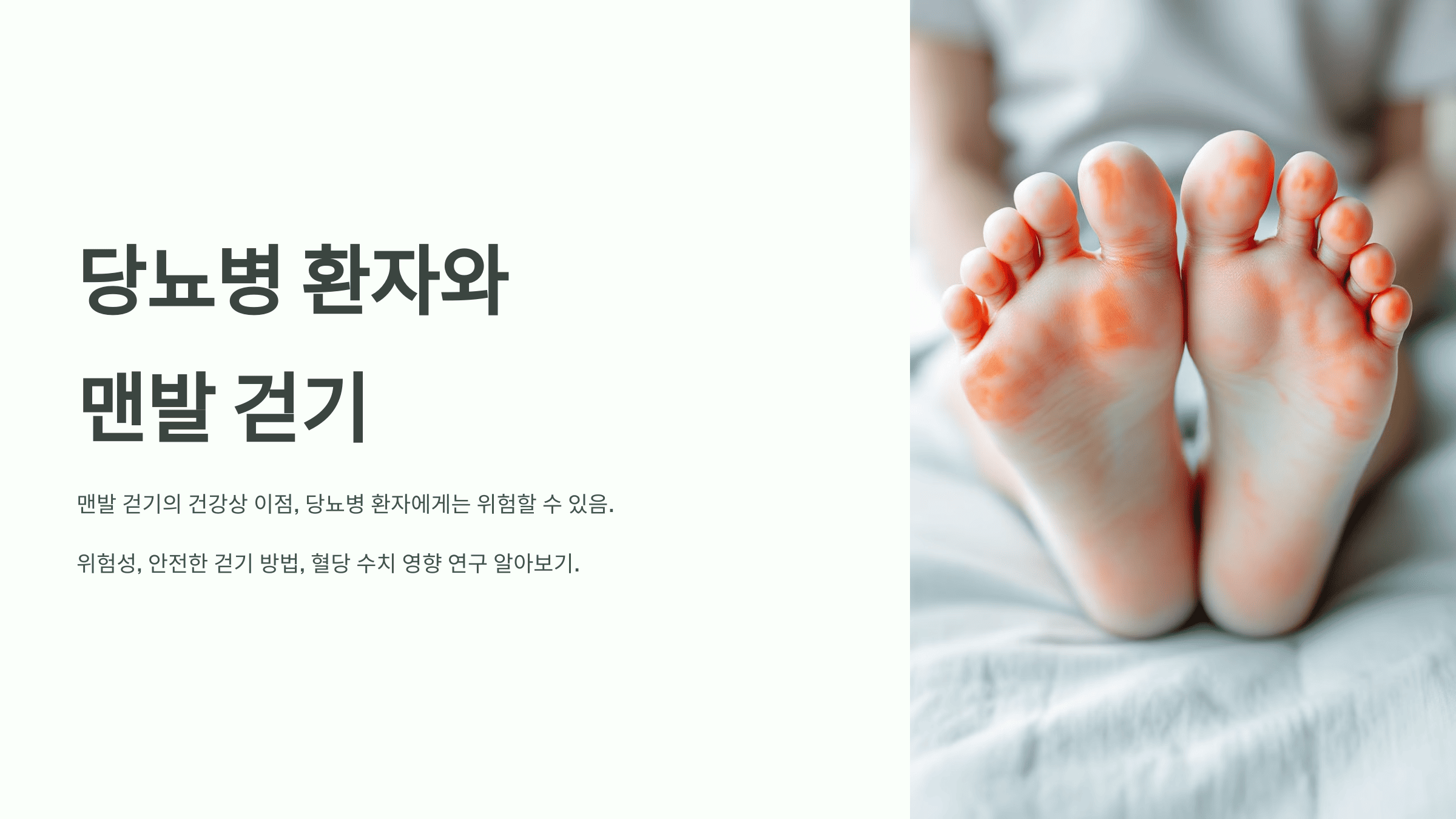최근 맨발 걷기의 건강상 이점이 주목받고 있지만 당뇨병 환자에게는 오히려 위험할 수 있습니다. 이 글에서는 당뇨병 환자가 맨발 걷기를 할 때 직면할 수 있는 위험성과 당뇨병 환자를 위한 걷기 방법, 맨발 걷기의 혈당 수치 영향에 대한 연구에 대해 자세히 알아보겠습니다.
