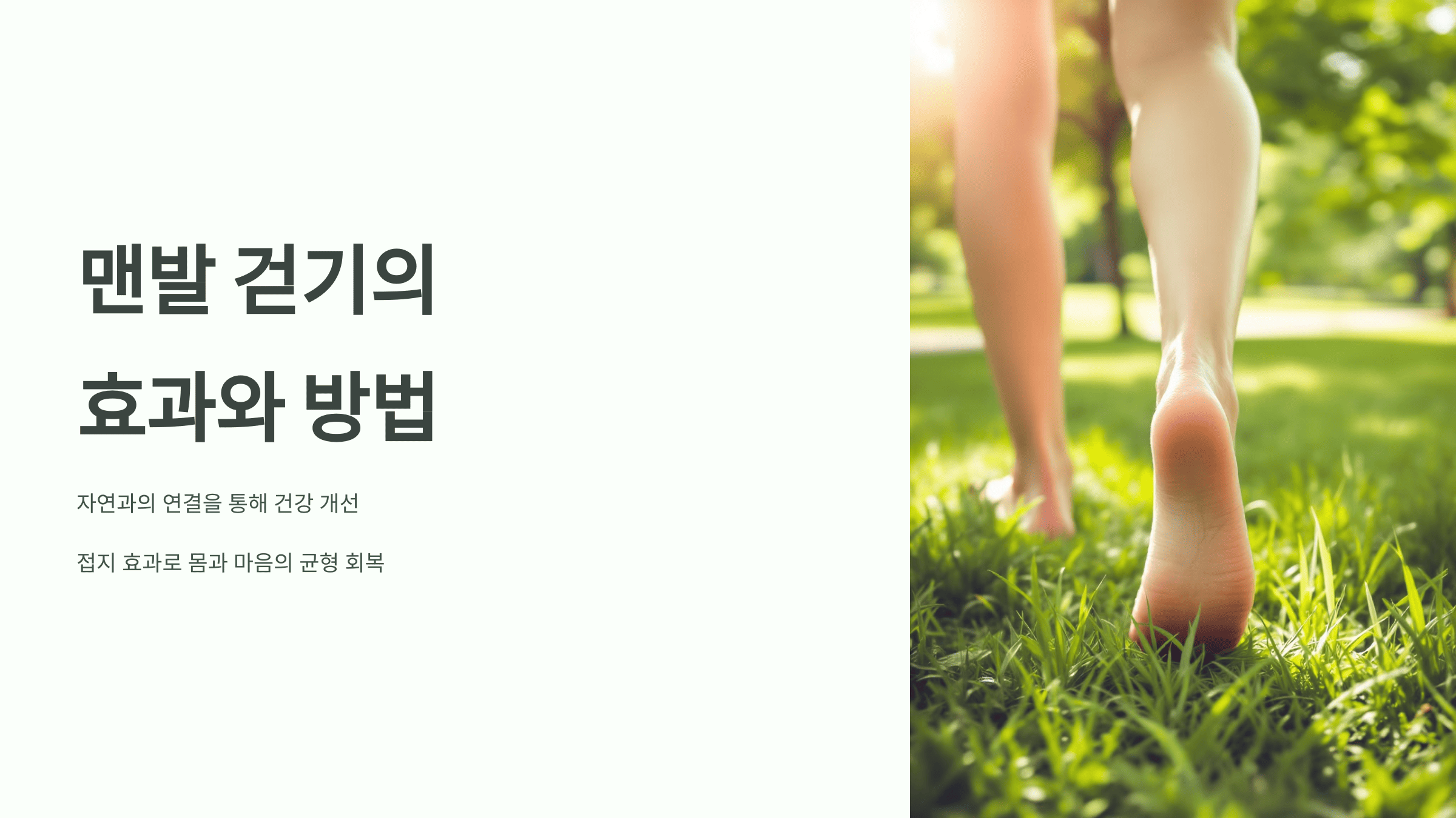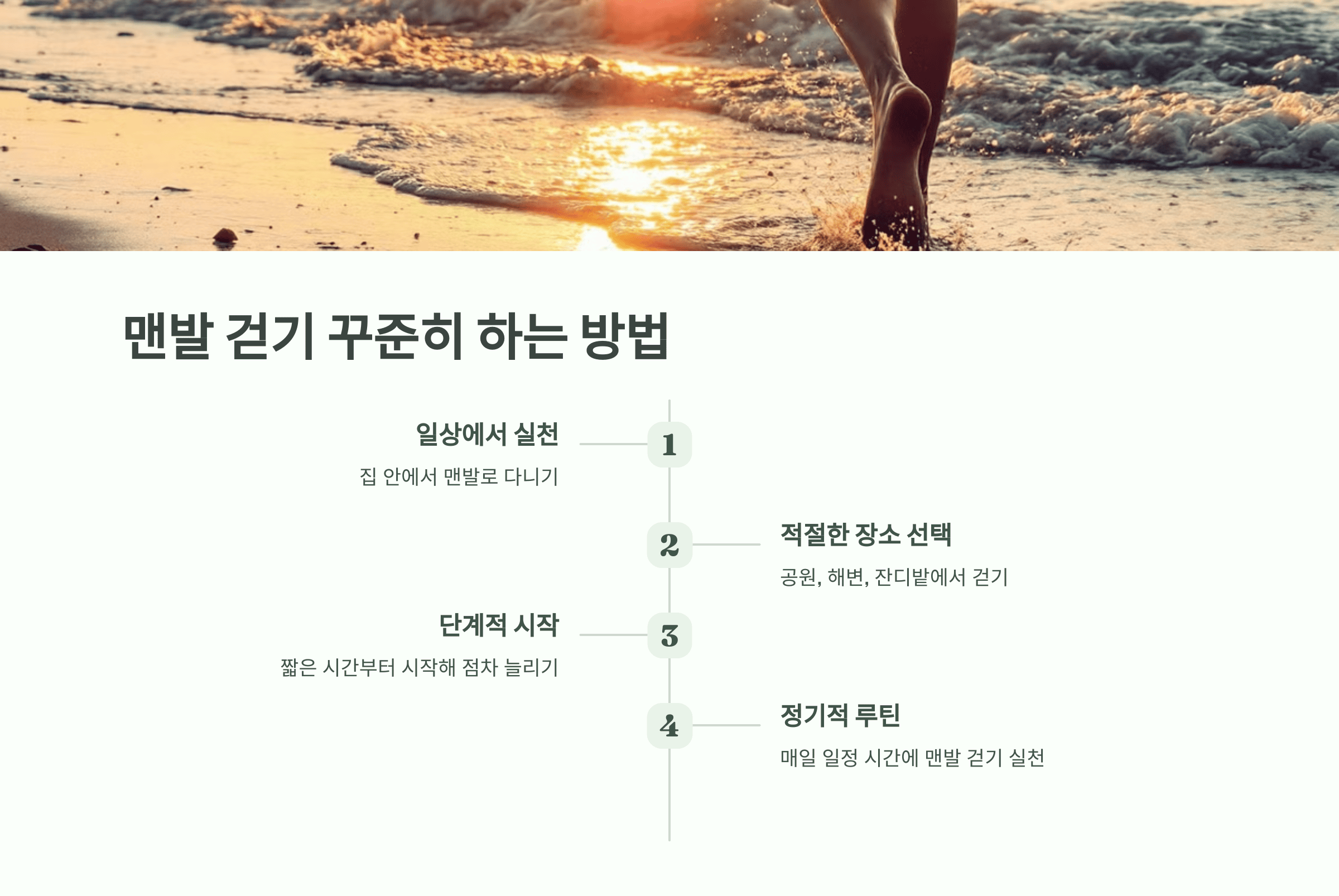 맨발 걷기는 우리 몸과 마음을 자연과 다시 연결시켜 주는 효과적인 방법입니다. 접지 효과를 통한 염증 감소, 혈액순환 개선, 발 건강 강화 등 다양한 효능을 누릴 수 있습니다. 꾸준한 실천을 위해 일상에서 쉽게 맨발로 걷는 습관을 들이고, 적절한 장소와 루틴을 설정하는 것이 중요합니다. 맨발 걷기를 통해 자연의 힘을 느끼고, 건강과 활력을 되찾아 보시기 바랍니다.