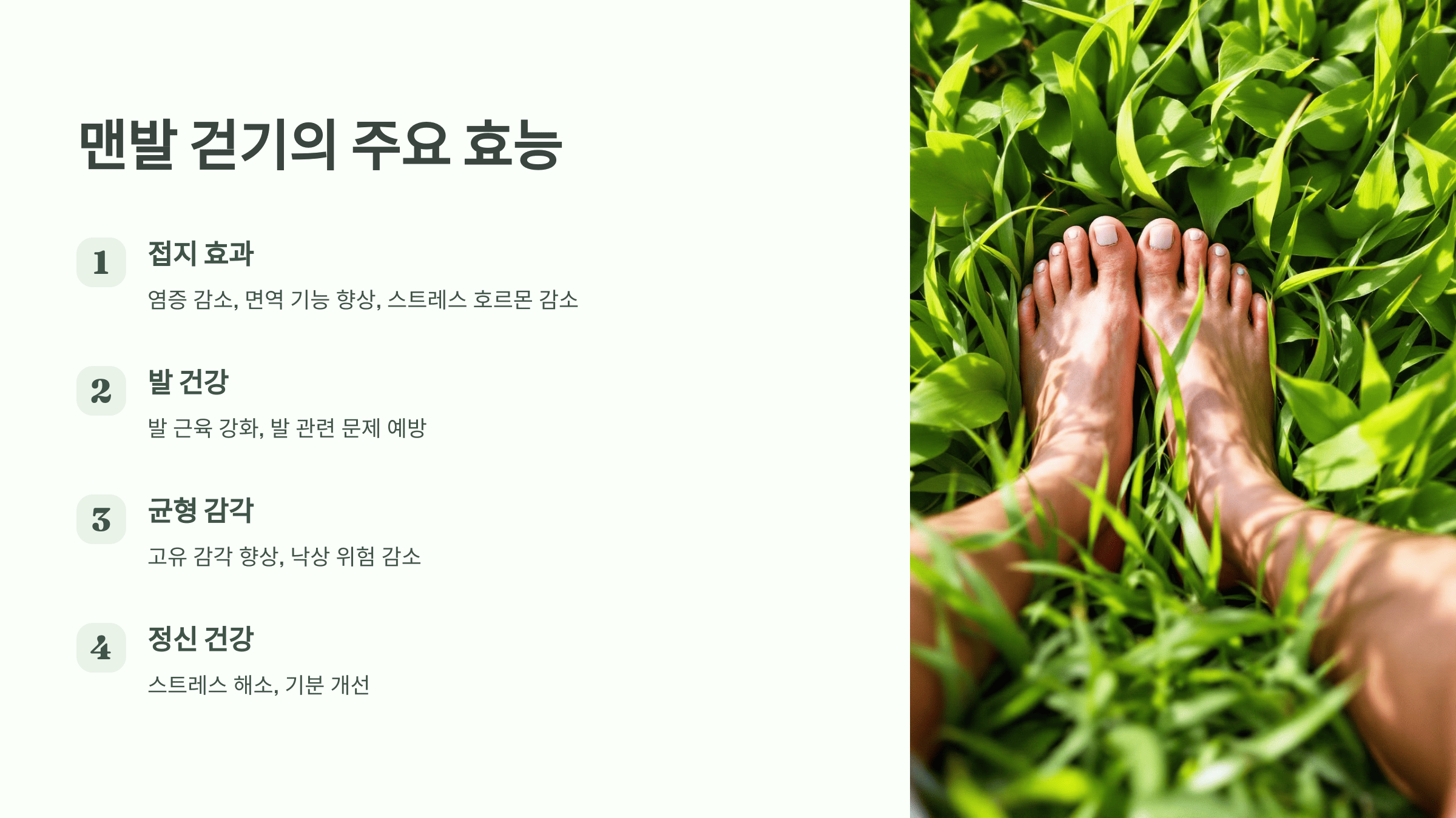 맨발로 땅을 직접 밟는 것은 '접지' 또는 '어싱(earthing)'이라고 불리는 효과를 가져옵니다. 이는 스트레스를 줄이고 기분을 개선하는 데 도움이 될 수 있습니다. 맨발로 자연 속을 걷는 동안 우리는 신체와 자연의 연결을 더 깊이 느끼게 되며, 이로 인해 마음의 평화를 찾고 스트레스를 해소할 수 있습니다. 특히 공원, 해변, 숲 속에서 맨발로 걷는 것은 심리적인 안정감을 주며, 명상 효과를 느낄 수 있게 해 줍니다.