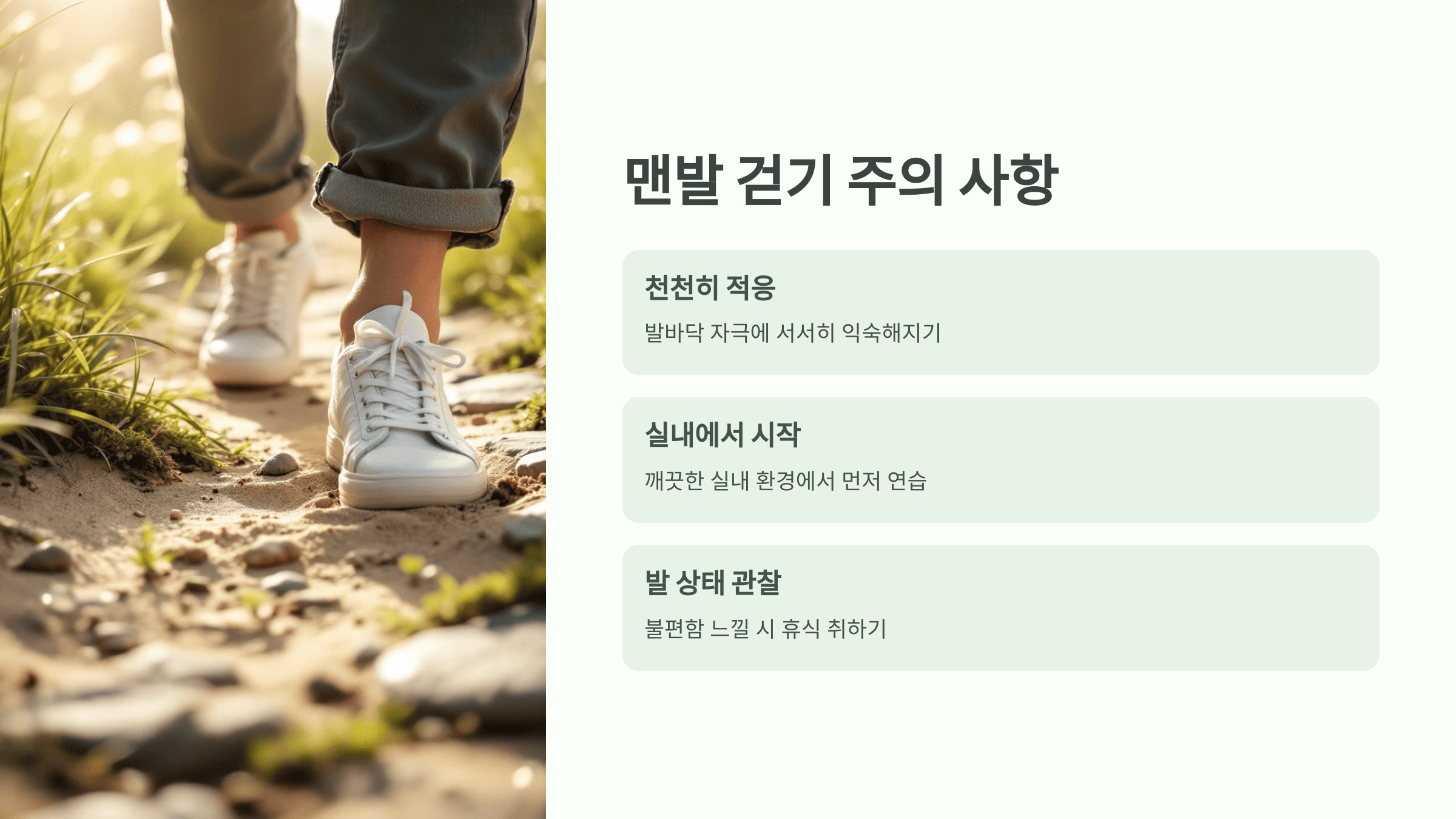 맨발 걷기는 많은 장점이 있지만 주의해야 할 점도 있습니다. 초기에는 발바닥에 직접적인 자극이 가해지기 때문에 통증이나 불편함을 느낄 수 있습니다. 걷기나 맨발로 걷는 것을 처음 접한다면, 천천히 익숙해지는 것이 중요합니다. 깨끗하고 매끄러운 표면에서 실내에서 맨발로 걷기 시작한 다음, 점차 마당이나 모래사장과 같은 실외 환경으로 옮겨가세요. 발이 어떻게 느껴지는지 주의 깊게 살피고 불편함을 느낀다면, 맨발로 걷는 시간이나 강도를 늘리기 전에 발이 적응할 시간을 주시는 것이 필요합니다.